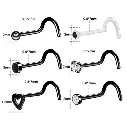 6Pcs/Set Black Nose Stud Rings Crystal Nose Corkscrew Piercing-Economic Set