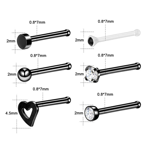 6Pcs/Set Black Nose Stud Rings Clear Bioflex Nose Bone Piercing-Economic Set