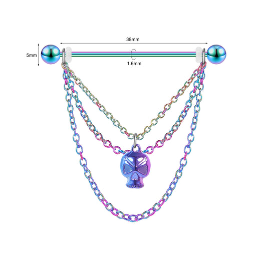 14G Skull Rainbow Industrial Barbell Dangle Chain Helix Ear Piercing