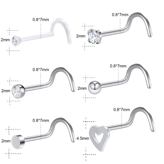 6Pcs/Set Silver Nose Stud Rings Clear Bioflex Nose Screw Piercing-Economic Set