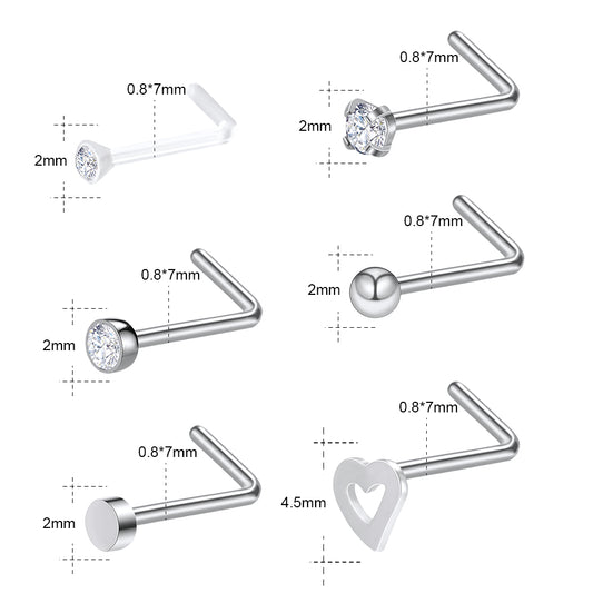 6Pcs/Set Silver L Shaped Nose Stud Rings Clear Bioflex Nose Piercing-Economic Set