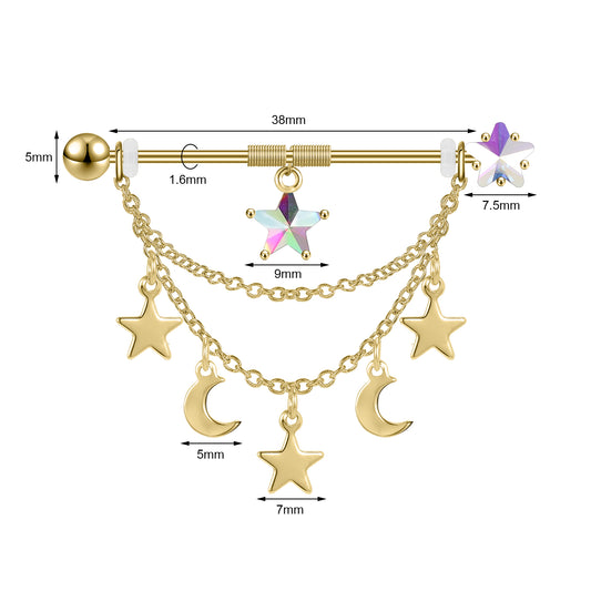 14G Gold Moon Star Industrial Barbell Earring Dangle Chain Helix Ear Piercing