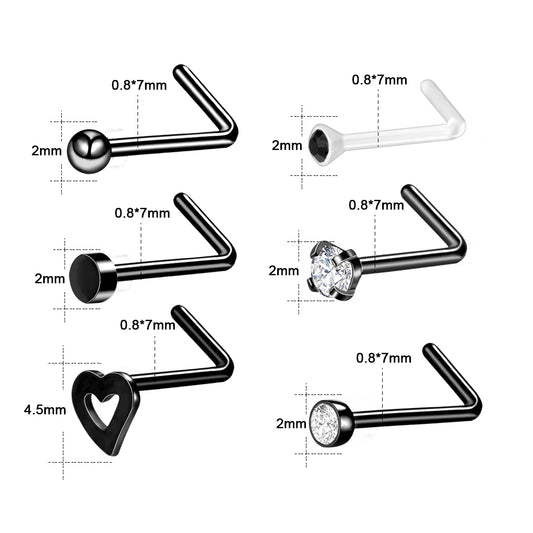 6Pcs/Set Black L Shaped Nose Stud Rings Clear Bioflex Nose Piercing-Economic Set