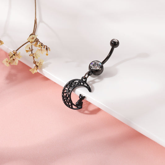 Moon and Cat Dangle Belly Rings/ Black Stainless Steel
