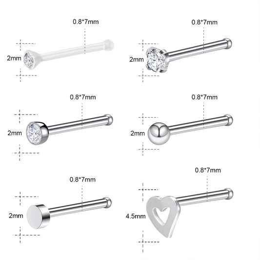 6Pcs/Set Silver Nose Stud Rings Clear Bioflex Nose Bone Piercing-Economic Set