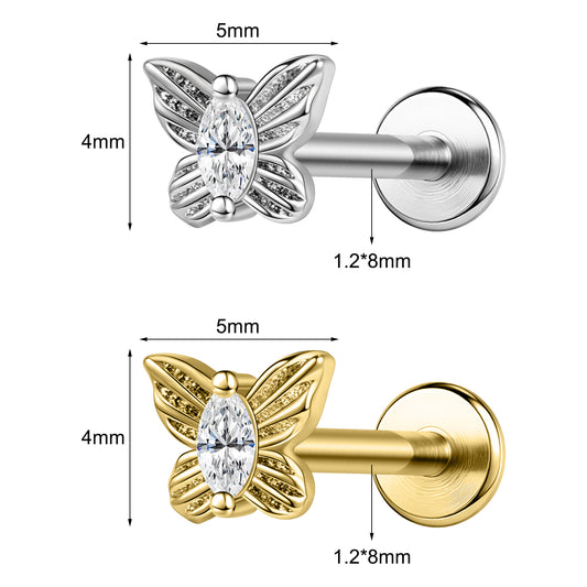 16g Butterfly Labret Ring Flat Back Stud Earring CZ Conch Helix Lip Piercing