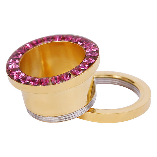 1 Pair Ear Plug Tunnel Pink CZ Crystal with Coating Gold Stainless Steel Ear Gauges