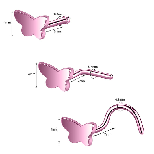 20G Pink Butterfly Nose Studs Piercing Nose Bone Shape L Shape Crokscrew Nose Rings Stainless Steel Nostril Piercing